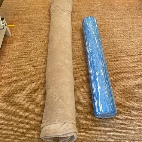 1. If you can’t throw a foam roller in your trunk, or are traveling by air, roll up a couple of beach towels or blankets to approximately 36″ x 6″ and use that as you would a foam roller.